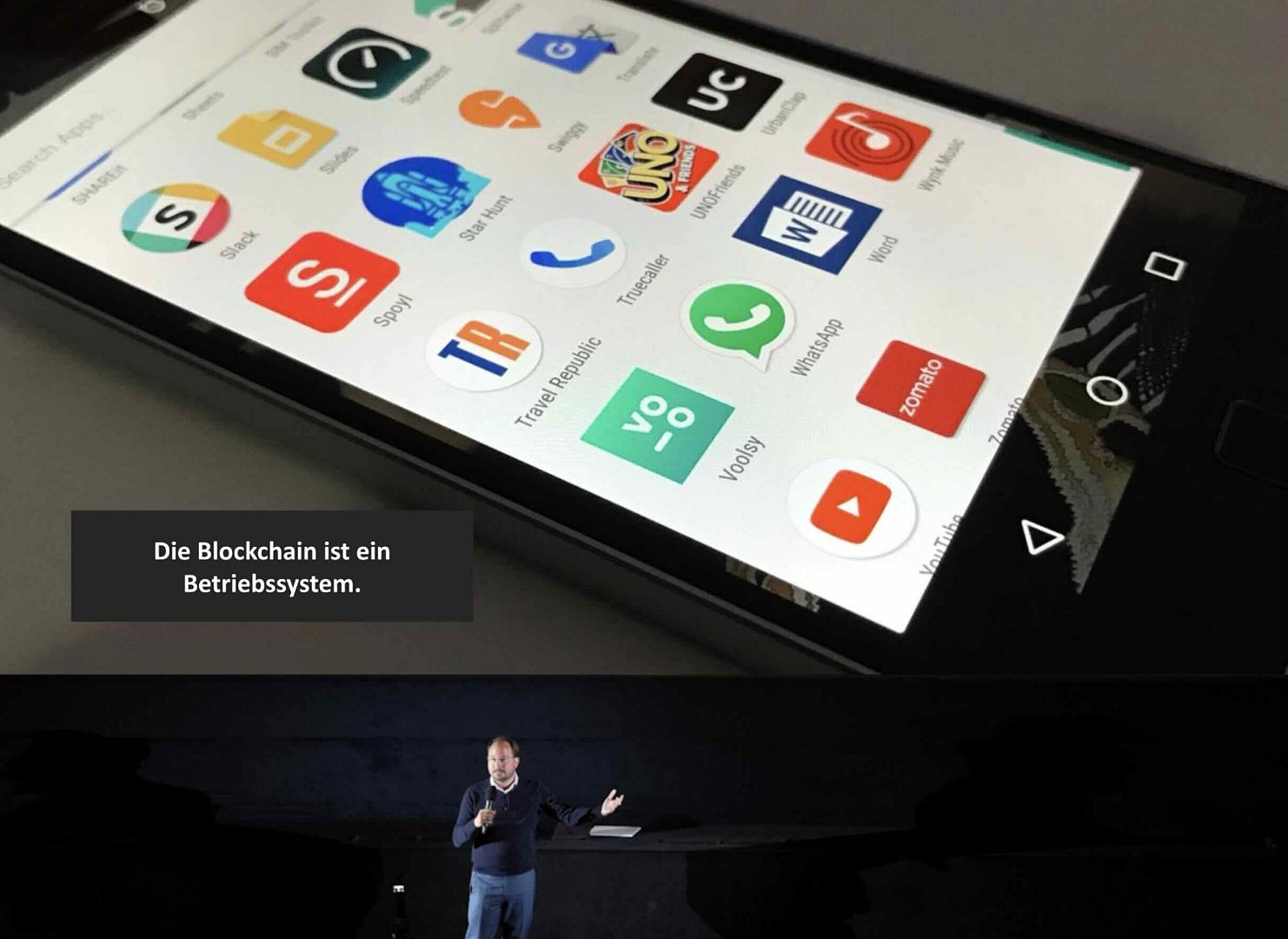 Die Blockchain kann als globales, ausfallsicheres Betriebsystem gesehen werden kann. Auf diesem Betriebssystem können Programme (sogenannte “Smart Contracts”) entwickelt werden die ohne Mittelsmann beetrieben werden.